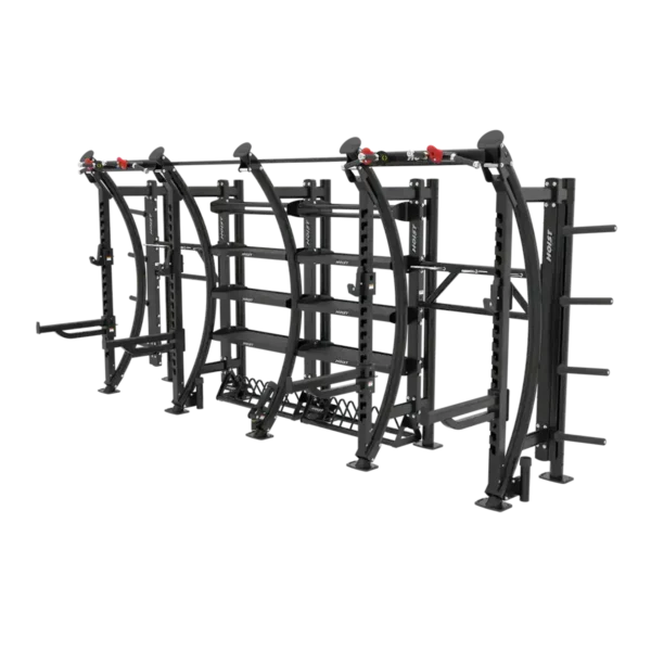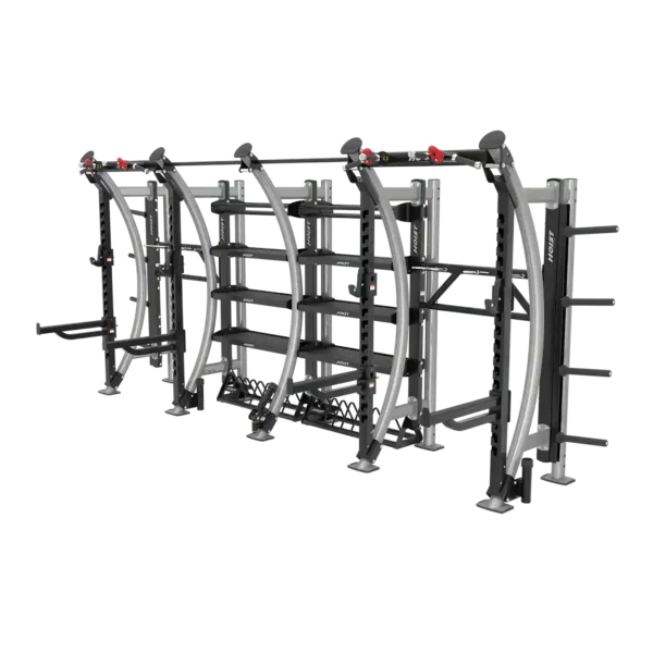 The HOIST 4 Elements Functional Single-Sided PS-4E-FSS is a complete half-rack and storage system, offering everything you need for a functional training setup. It includes two half-rack stations, two storage sections with 4 ft. horizontal plate racks, 4 ft. shelves, and 4 ft. ball racks. Additionally, it features a 4 ft. Multi-Grip Chin-Up station, 7 ft. vertical plate tree, and a Land-Mine Vertical Olympic Bar Holder. The frame is available in matte black and platinum.