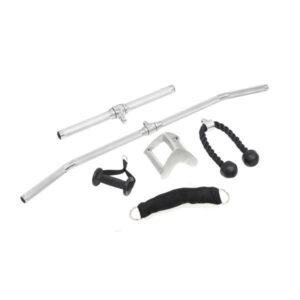 • Includes: (1) Aluminum Lat Bar, (2) Aluminum Curl Bar, (1) Triceps Rope, (2) Padded Ankle Strap, (2) Single Aluminum D-Handle and (1) Double Aluminum D-Handle