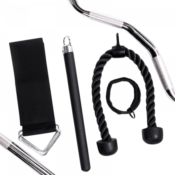- Included Accessories: Dual Hook Straight Bar, Dual Hook Curl Bar, Sports Handle, Tricep Rope, Ankle Strap, Chin/Dip Belt