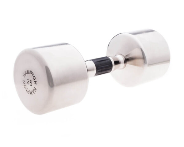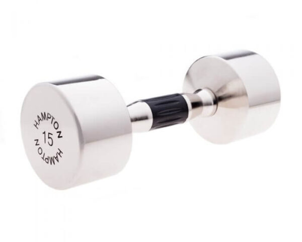 The European style design is what sets Hampton Chrome Beauty Grips apart from all the rest. Inlaid urethane grips makes these dumbbells as easy to handle as they are on the eye. Hydraulically pressed heads create a permanent bond with the handle. The nickel-plated chrome has the strongest finish in the industry.