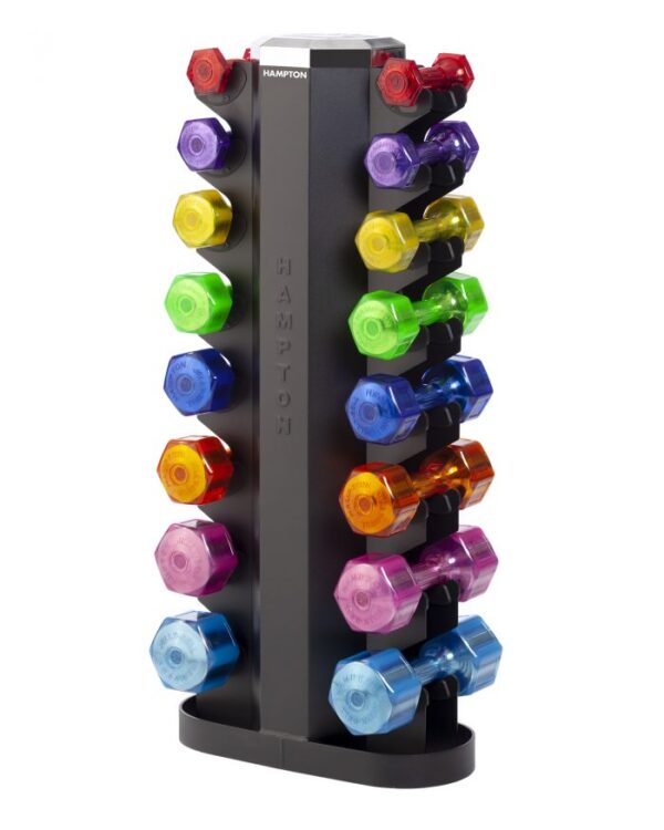 Jelly-Bell® Mini Set #1: Jelly-Bell® 6 Pair Set | 1 pair each 2.5, 5, 7.5, 10, 12.5, 15 LBS | Includes: 2 Sided Vertical Jelly-Bell® Rack — holds 6 pairs — 19″ W x 8.5″D x 32″ H