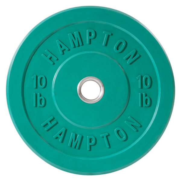 Hampton Fitness has redesigned our classic bumper plate to meet the modern needs of today’s power lifting community of athletes. Our slim line design will allow the user to add more plates to their bar, as well as quiet the impact when being dropped. The precision plates are machined from a solid piece of steel and are coated by over 1 inch of virgin rubber around the outer diameter. Which in return keeps the bar and plates from bouncing too much when being dropped. The plates are centered by a stainless steel hub for a snug fit that prevents the plates from moving during the user’s lift. These sturdy and colorful 45-, 35- and 25-pound plates are backed by a 5-year commercial warranty. The 5- and 10-pound training plates are also constructed out of 100% virgin rubber and allow the user to make much more incremental jumps in weight lifting.