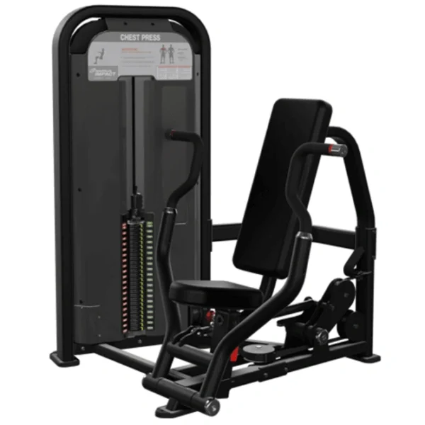 Chest press machine with pull-pin adjustment, gravity-assisted positioning, and smooth incremental weight system for safe and effective upper body workouts.