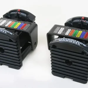Bands on the side rails show the weight of the dumbbell selected with the pin. The pin covers the band/rail that’s been selected to easily show what the weight is. Some models use color charts on the handle to coordinate with the color band on the rail.