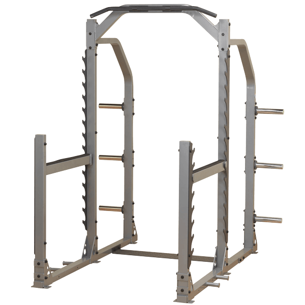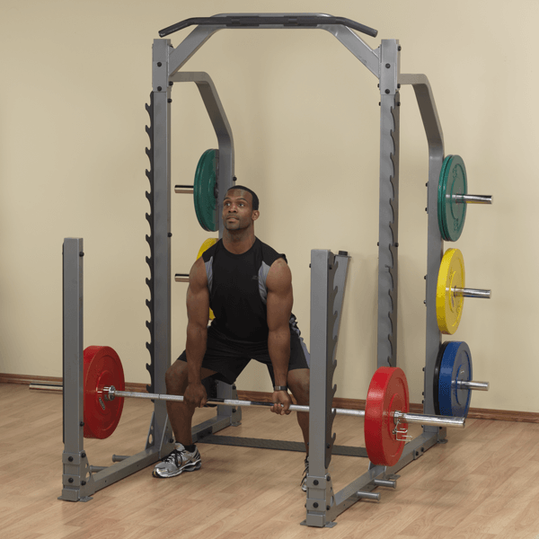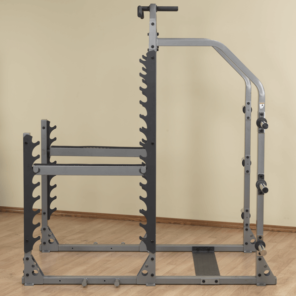 ¼” solid steel gun rack style liftoffs provide multiple positions for a comfortable starting position. Rock solid adjustable safeties allow users to workout safely and maximize their load. The 2”x3” 11-gauge steel frame holds up in any heavy use environment. The back frame is extended to allow spotters easy access. Integrated weight storage keeps the plates right where you need them. The SMR1000 has integrated pegs for strength bands for extreme plyometric training. The integrated chinning bar allows users to incorporate pull-ups, chin-ups, inversion, ab slings, and other body weight resistance systems for amazing versatility. The SMR1000 is an uncompromised monster-free weight system. The SMR1000 Muti-Rack system is perfect for heavy use, heavy load environments, like schools, military, police, and fire departments.