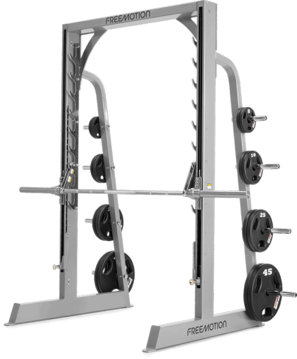 The Freemotion Smith Machine is a workhorse in the weight room. Add a bench and workout options can be endless. Guide rods with linear bearings offer smooth motion. Regardless of exercise, users can set the range of motion with the ratcheting safety stops and multiple bar hooks.