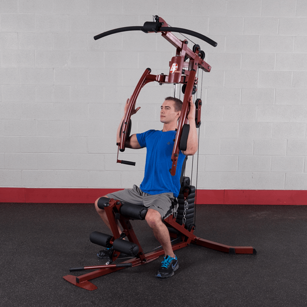 Complete gym in one compact, affordable machine. The padded pressing arms follow the natural arc of a free-weight bench press and pectoral dumbbell fly. Features 2200 lb. test nylon coated aircraft quality cables and fiberglass pulleys with ball bearing movement on solid axle rotation. Includes high pulley with wide grip lat bar and low pulley with narrow grip low row bar. No cable change design!